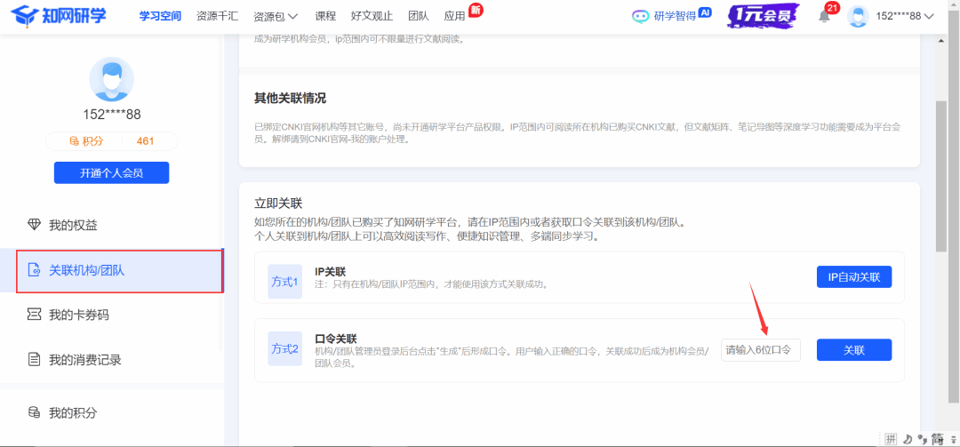 2.点击左侧“关联机构/团队”,选择口令J2MECD(池州学院专用口令)关联(请勿使用IP绑定)。