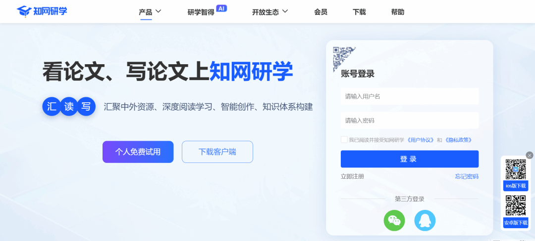 进入知网研学Web端网站,点击下载,在下载页面,根据电脑系统选择相应版本的平台。