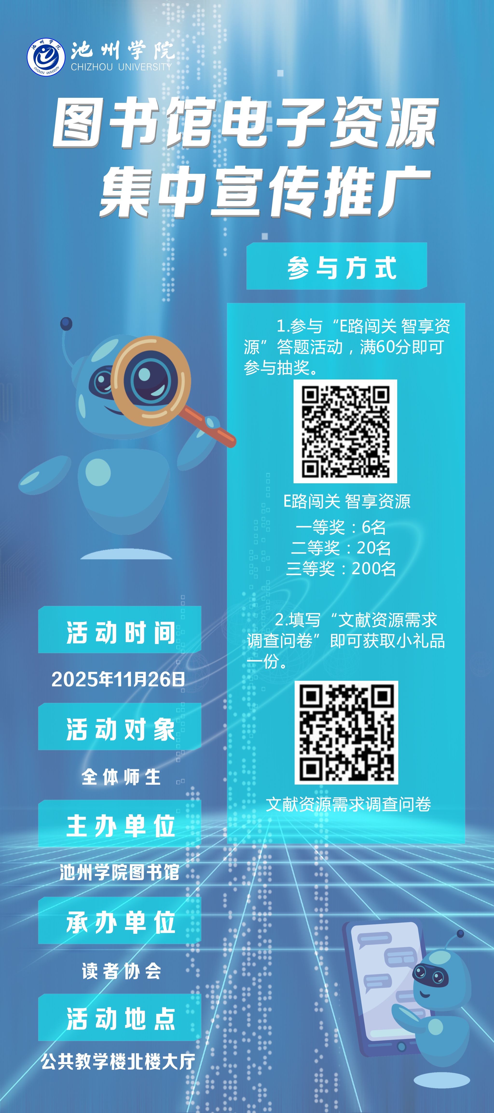 首页 活动 活动预告 正文 图书馆电子资源集中宣传推广 发布日期:2025年11月24日 报名参与 报名时间:2025-11-26 08:29~2025-11-26 08:29 上一条:无 下一条:第五届“知网杯”池州学院大学生信息素养大赛