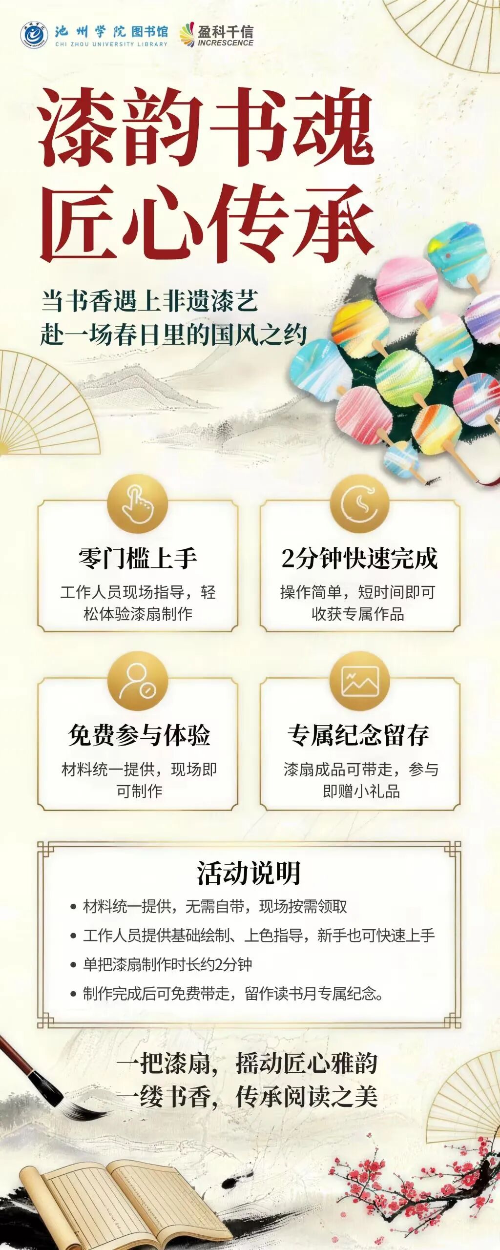 首页 活动 活动预告 正文 活动通知 | 读者服务月:春日阅读三重奏,集章赢好礼~ 发布日期:2026年04月13日 报名参与 报名时间:2026-04-22 10:00~2026-04-22 10:00 春日阅读三重奏集章赢好礼墨香、漆韵、极速寻书……解锁你的「书式」周三!春日阅读三重奏这个读书月图书馆把“好玩”和“好读”打包送给你! 三个活动,一次集齐志愿时长 + 第二课堂学分 + 限量好礼 手慢无!活动集章活动时间:4月22日 10:00-16:00集章兑奖地点:图书馆前广场活动简介:活动名称关键词集章数量活动1:书适圈·青年派对书展千余本新书·图书荐购1~3枚活动2:非遗漆扇制作零门槛·2分钟成品·免费带走1枚活动3:春日阅动·极速寻书令30分钟·索书号挑战·借书 1~3枚集章规则与奖励在任一活动处领取「春日阅读护照」;每完成一个活动,在「春日阅读护照」上盖章; 3项活动全部参加,凭「春日阅读护照」额外领取以下奖品(按借书/荐购数量分档)完成情况赠送礼品荐购1本书+借出1本+漆扇制作定制帆布包1个荐购2本书+借出2本书+漆扇制作定制帆布包1个+笔记本1本荐购3本及以上+借出3本及以上+漆扇制作定制帆布包1个+笔记本1本+限量玩偶1个每项活动各集1张及以上 = 额外赢取阶梯大礼 + 志愿汇 + 第二课堂学时 + 精美漆扇学时 & 志愿时长志愿汇:完成3项活动,可获得3小时志愿服务时长 第二课堂:完成可获得3学时精美漆扇:非遗制作活动自带一把成品活动一:书适圈·青年派对书展千余本新书空降图书馆 你选书,图书馆买单!在书展现场翻阅最畅销的文学、社科、科技、艺术类图书,遇到心仪的那一本——现场扫码荐购,图书馆审核后纳入采购清单,你就是这本书的 “第一位读者”!01活动详情活动时间4月22日 10:00-16:00活动地点池州学院图书馆前广场活动说明(1)现场操作:需在书展现场翻阅图书,选中心仪书籍后,现场扫码荐购,不可线上远程操作(2)审核机制:荐购的图书需经图书馆审核通过后,才会纳入采购清单活动二:漆韵书魂・匠心传承💫「零门槛上手」:工作人员全程提供基础指导,手残党也能轻松解锁国风美学。💫「2分钟get成品」:快速制作不费时间,轻松收获属于你的专属漆扇。💫「免费带走+惊喜好礼」:成品可作为读书月纪念留存,参与即赠定制小礼品。💫「氛围感拉满」:在墨香与漆韵交织的空间里,沉浸式感受传统文化与阅读的浪漫共鸣。01活动详情活动时间4月22日 10:00-16:00活动地点池州学院图书馆前广场漆扇现场制作工作人员现场提供漆扇、颜料、简易工具及基础指导,师生可免费参与制作。制作完成后可直接带走,操作简单、耗时短,兼顾趣味性与读书月文化氛围。活动说明(1)材料全免:材料统一提供,无需自带,现场按需领取;(2)新手友好:工作人员提供简单绘画、上色指导,新手可快速上手,单把漆扇制作时长2分钟;(3)专属纪念:制作完成的漆扇可作为读书月纪念,免费带走,参与即赠小礼品。活动三:春日阅动·极速寻书令把图书馆变成「寻宝地图」限时30分钟,根据索书号找到指定图书并借出!01活动详情活动时间4月22日 10:00-16:00活动地点池州学院图书馆 全馆各阅览区 活动说明(1)在起点确定要借的书籍 ,拿走对应的书签(2)根据书签的信息,快速找到图书并完成借阅手续(3)回终点核对,根据借的书本数量确定集章的数目(1~3枚)小贴士“借出”:在「极速寻书令」中成功借阅的图书数量 “荐购”:在「书展」中扫码推荐的图书数量 漆扇制作只需参与一次即可参与方式无需提前报名,活动当天直接到图书馆前广场参加,集满3章后到兑奖处登记领奖。温馨提示图书借阅:请确保本人校园卡可正常借书(无欠费、超期等) 图书荐购:每人可荐购多本,不限数量,但阶梯奖励以3本为上限 漆扇制作:材料有限,做完即止 寻书挑战:请轻拿轻放图书,找到后到自助借还机或服务台办理借阅 安全提醒:书架间请勿奔跑,安全第一春日不迟,相逢有时一本书,一柄扇,一次寻宝冒险—— 这个读书月图书馆想把阅读变成一场流动的盛宴。 4月22日(周三)我们不见不散! 上一条:无 下一条:活动通知 | “文脉影韵”电影展播第二期:《南京照相馆》